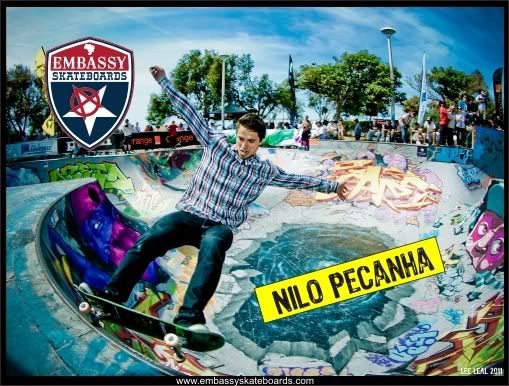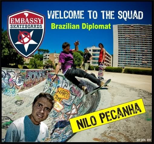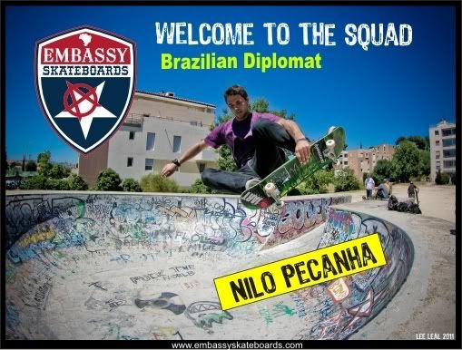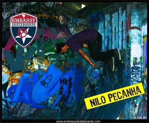 Embassy would like to give a HUGE TEXAS welcome to Nilo Pecanha from Rio de Janerio, Brazil. He’s STOKED to join the Embassy squad. Nilo is no stranger to Bowl’s, Pool’s or Vert Ramp’s. He’s a veteran tranny skater and skates EVERYDAY. He has mad style and kills it everywhere he goes. He learned how to skate in the streets of Sao Paulo, learning to skate regular foot, Later he adapted to the tranny and started skating Goofy-foot. Brazilians are always switching it up. MAD SKILLS. He loves going on road trips in his native Brazil from Sao Paulo to Rio, Nilo and his friends are always looking for a place to shred. He went on his first World Cup European Tour earlier this year. He’ll be on the tour again in 2012. Look for him to be joining the rest of the Embassy Squad on the road for future event’s, demo’s, contest, and just sharing the vibe of keeping it real. SKATE FOR FUN!!!