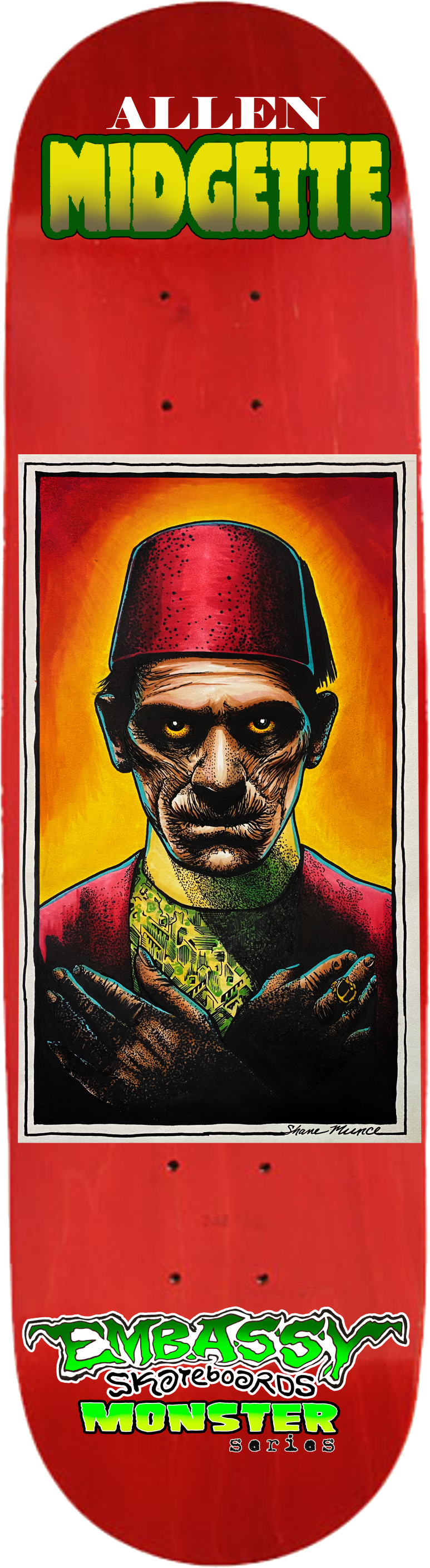 Shane Munce brings Ardeth Bey’s character to life with the Allen Midgette “Monster Series”. Measuring in at 8.5″ Wide, 32.5″ Long, 14.5″ wheelbase, Modern functional concave. 7 ply Canadian Maple Wood. Comes with top screen-printed Skully graphic in white. This is a very, very one time limited run on this Embassy Red colorway.