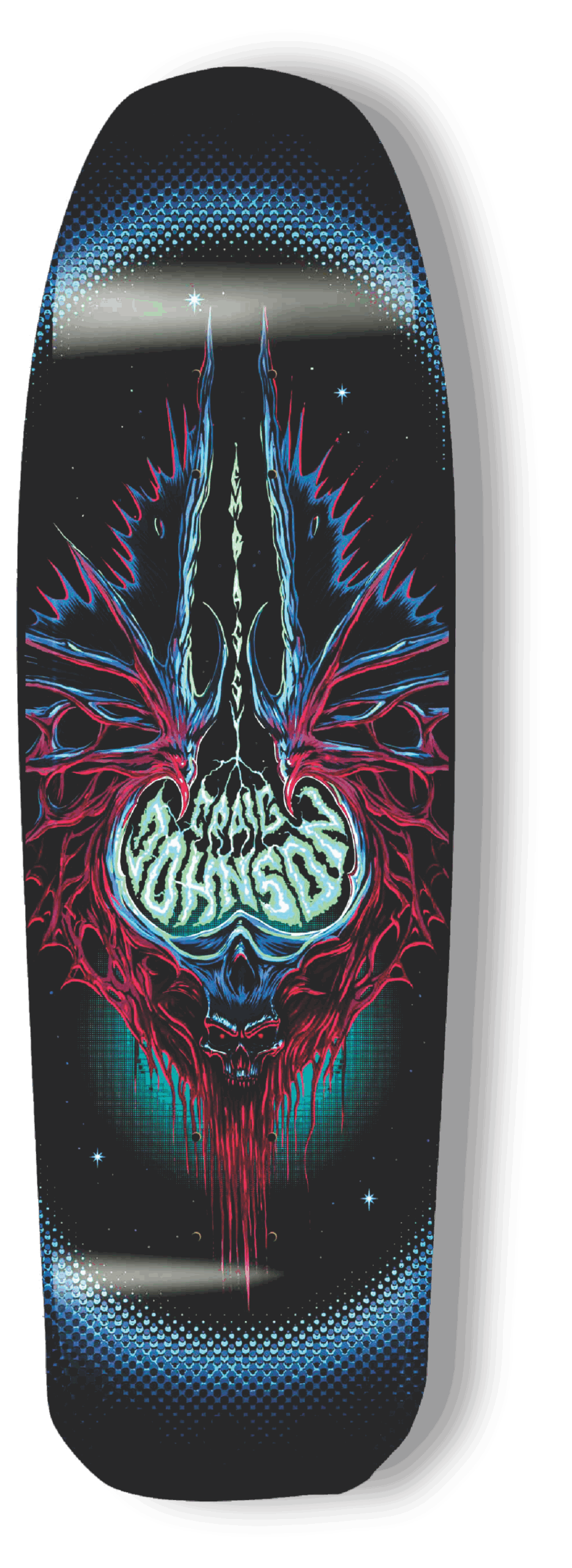 Introducing the new Craig Johnson “Space Odyssey deck”. It’s the standard 8.5″ with medium concave. This wild graphic is from the Martin Varbaro series. From his Zorlac days to ALVA to Embassy, Craig Johnson stands as a true icon- big, loud, fearless and forever 100% skateboarder. Embassy proudly presents his new graphics by Martin Varbaro from Argentina with the top classic “Skully” by Embassy house artist Shane Munce. On this 8.5″ x 33″ w/ 14.5″ Wheelbase
