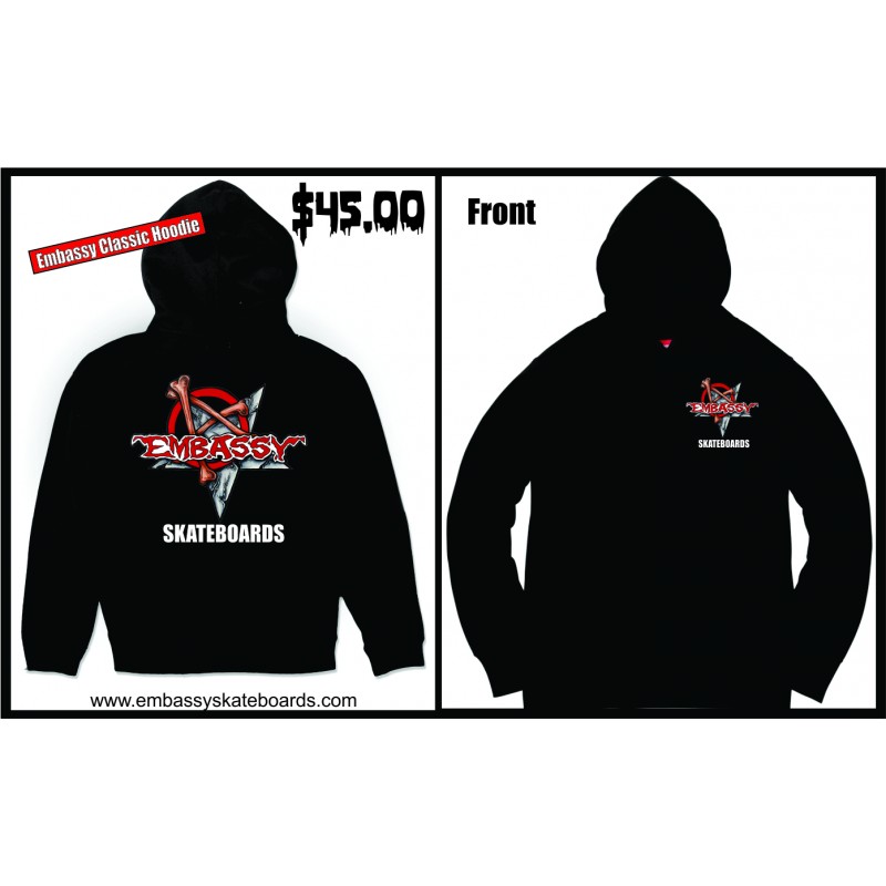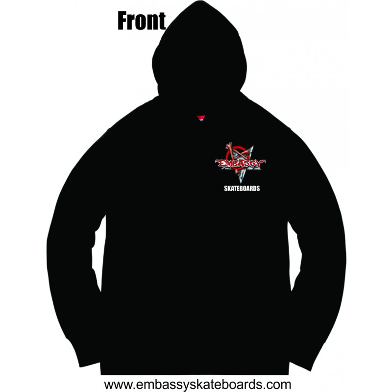 Embassy Skateboards, Black 100% Heavy Cotton Hoodie. Artwotk by Shane Munce.