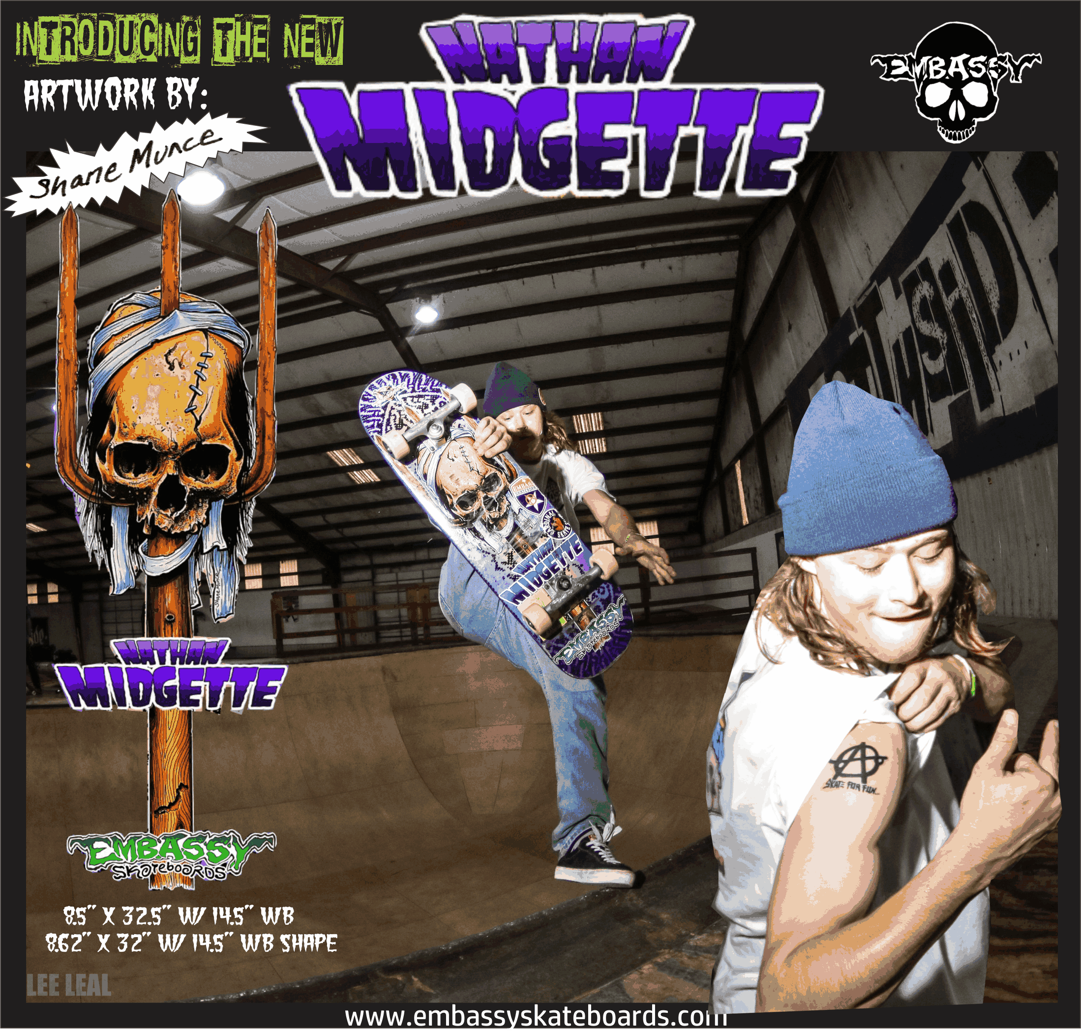 The new Ken Fillion Leprechaun graphic by “Ink Master” Shane Munce is here. Here’s the SICK POOL Shape coming in at 9.4″ with a healthy 15″ Wheel base. The concave is something your feet can sink into. They are going to go fast. FREE Embassy sticker pack in every box. Top Classic Skully screen printed graphic.