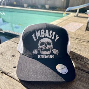 Caps $25.00 Add to cartIt’s October, so here’s the Embassy Halloween 5 panel black on black foam snapback trucker cap. It’s a colorway like never before, and it’s FUN!!!! FREE STICKER PACK in every box. Artwork by Embassy Specialist artist Shane Munce.