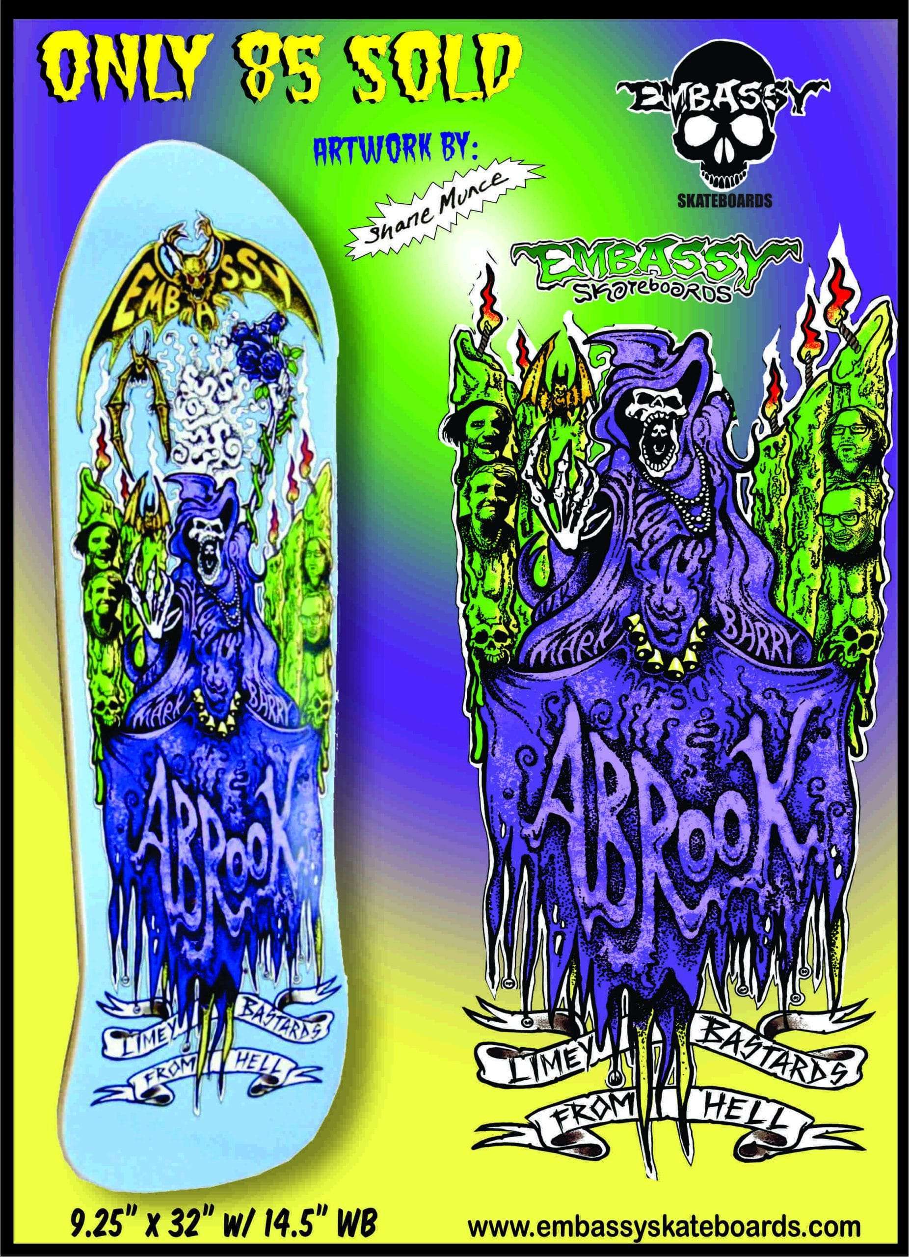 & Free ShippingThe 5th installment of much awaited Embassy Skateboards “OG Series” is the “Limey Bastards from Hell” ABROOK model on a Fishtail shape. Coming in at 9.25″ width, 32″ in length with a 14.5″ wheelbase. Artwork by Shane Munce. This is a VERY LIMITED EDITION, ONLY 85 WILL BE SOLD in this colorway and shape. Comes with top Skully logo.