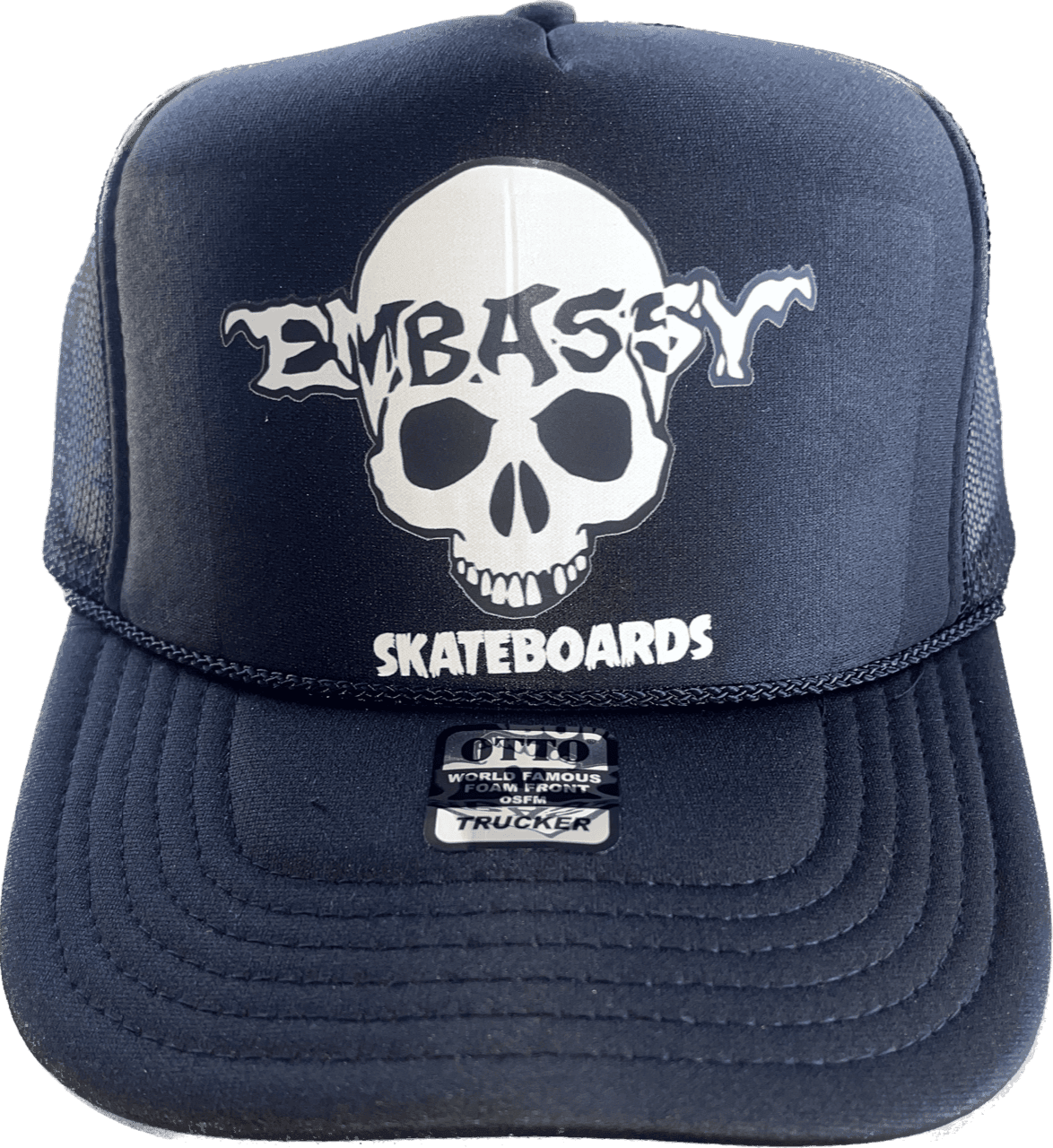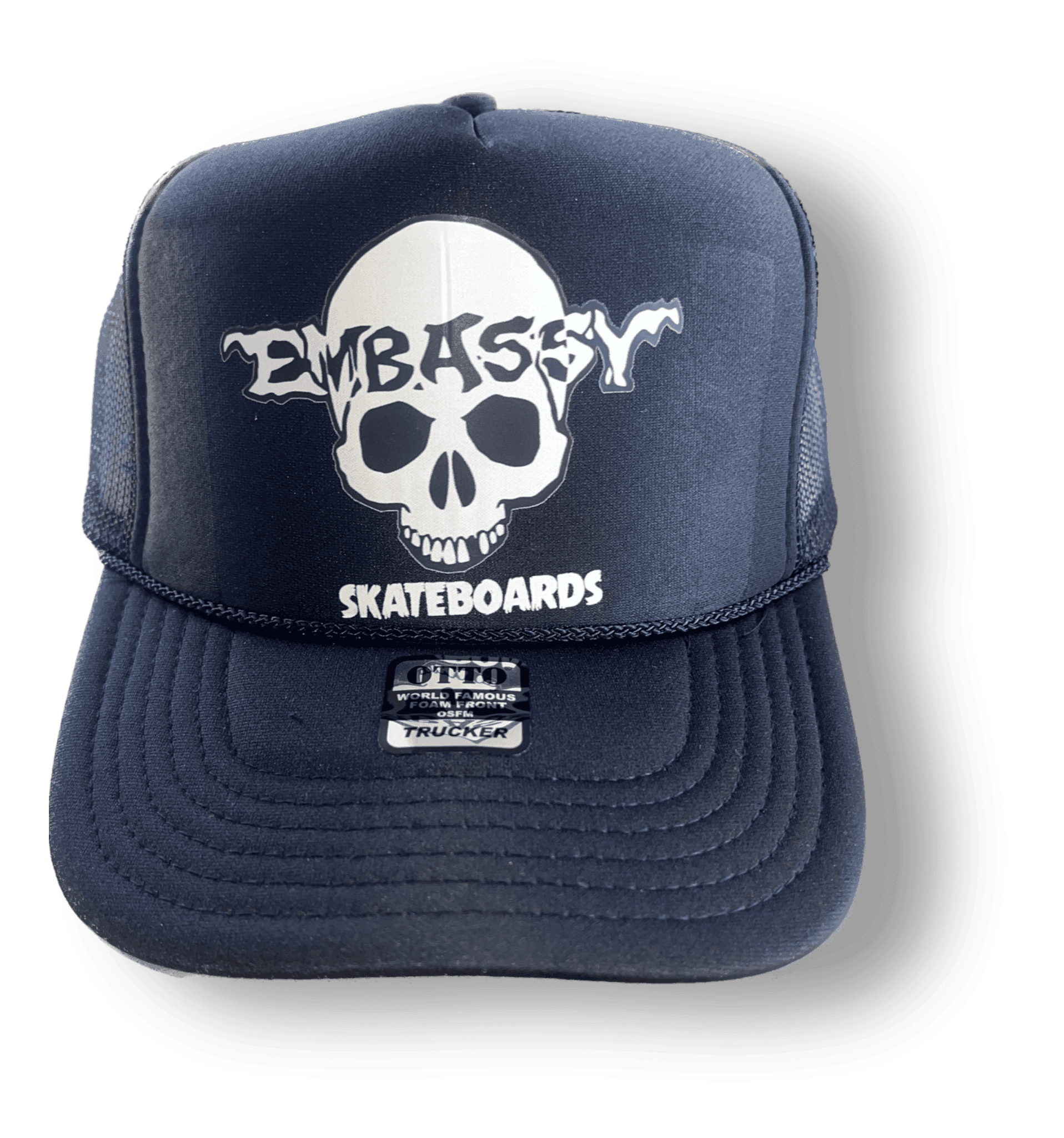 The “Classic” Embassy Skully Logo screenprinted in white ink on black 5 panel trucker cap.