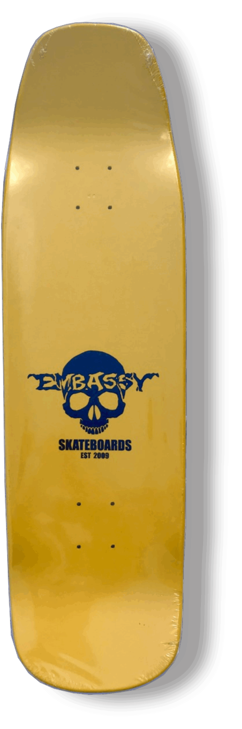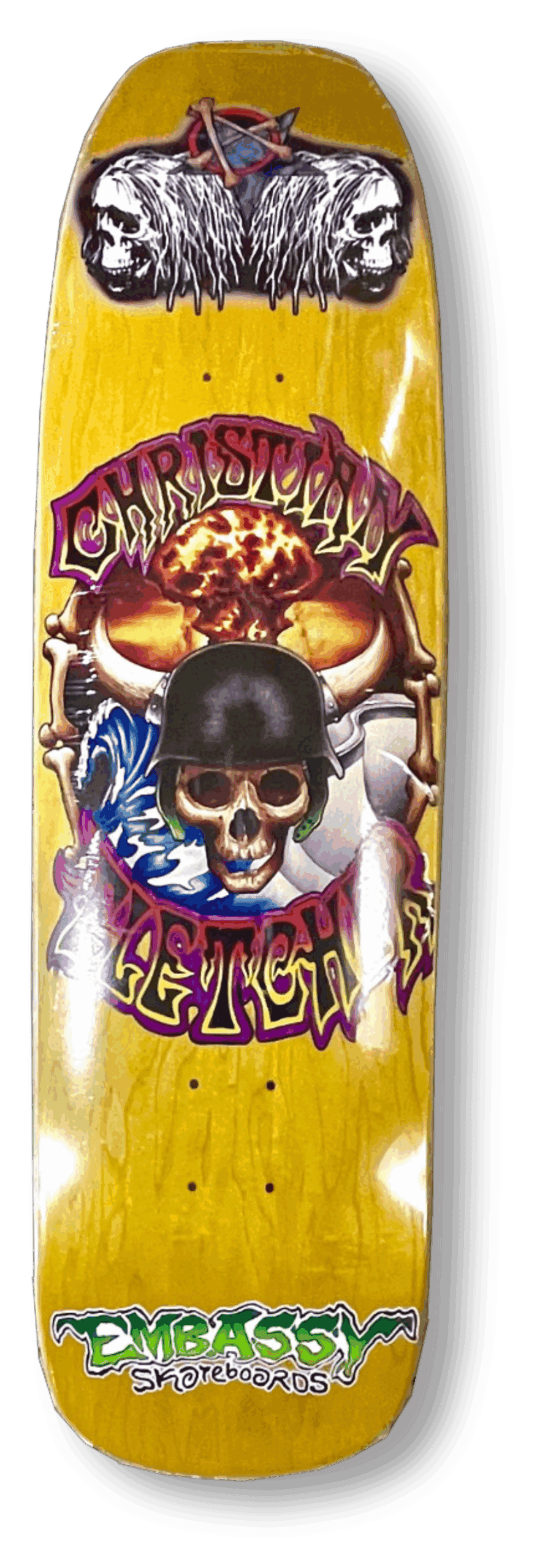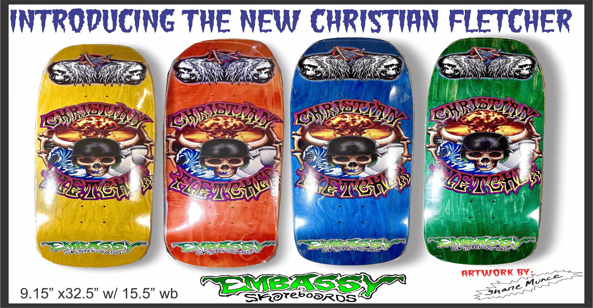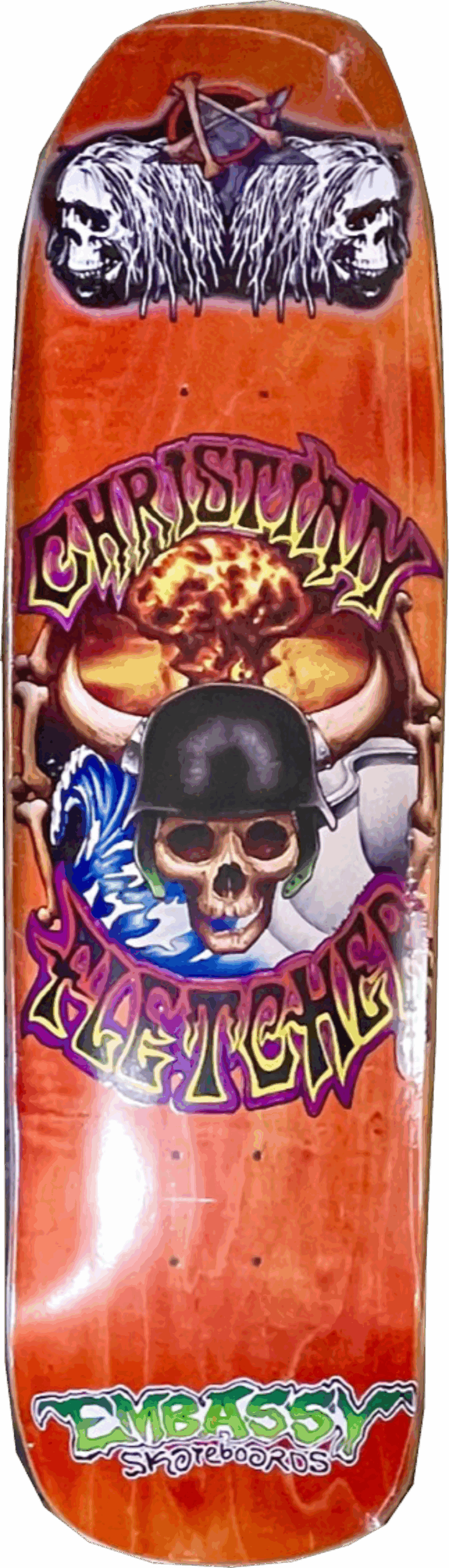 Embassy Skateboards, Christian Fletcher Pool Shape. 9.17″ x 32.5″ w/ 15.5″ wheel base, 7 ply Canadian maple wood. Functional, tested by Christian. Artwork by Embassy “Ink Master” Shane Munce. This artwork pays tribute to the Christian Fletcher brand. These are the only run with assorted color veneers, the next is a solid White dipped. This deck comes with the “Classic” Embassy Skully Logo on top. Free Shipping with every order, thanks for the support. Embassy Pride.