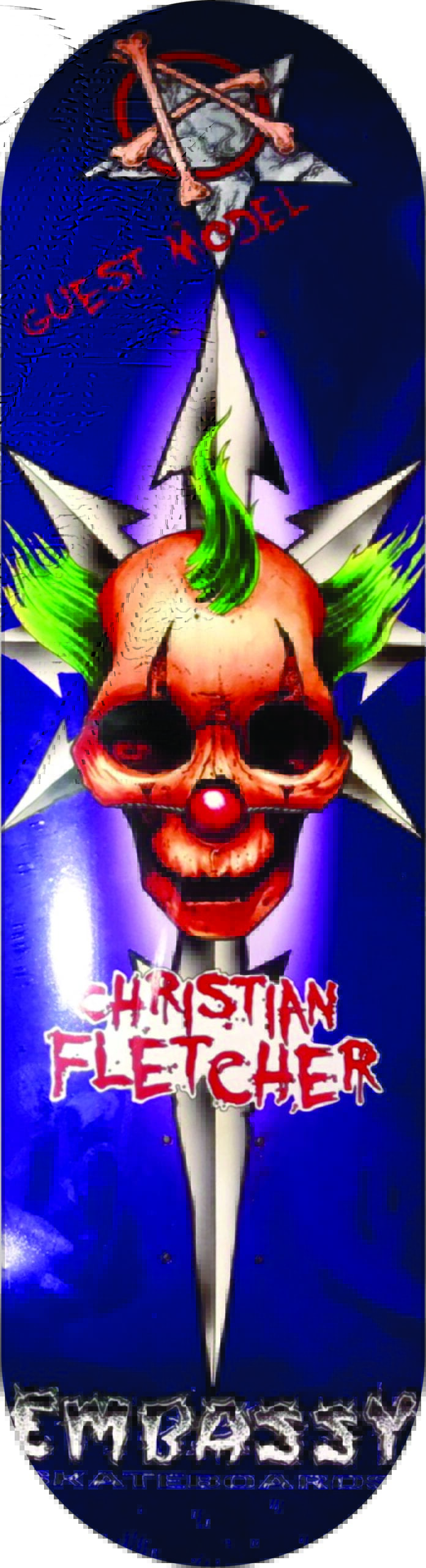 Christian Fletcher Embassy Skateboards 8.5″ x 32″ w/ 14.5″ wb popsicle shape with medium concave. Artwork by Shane Munce