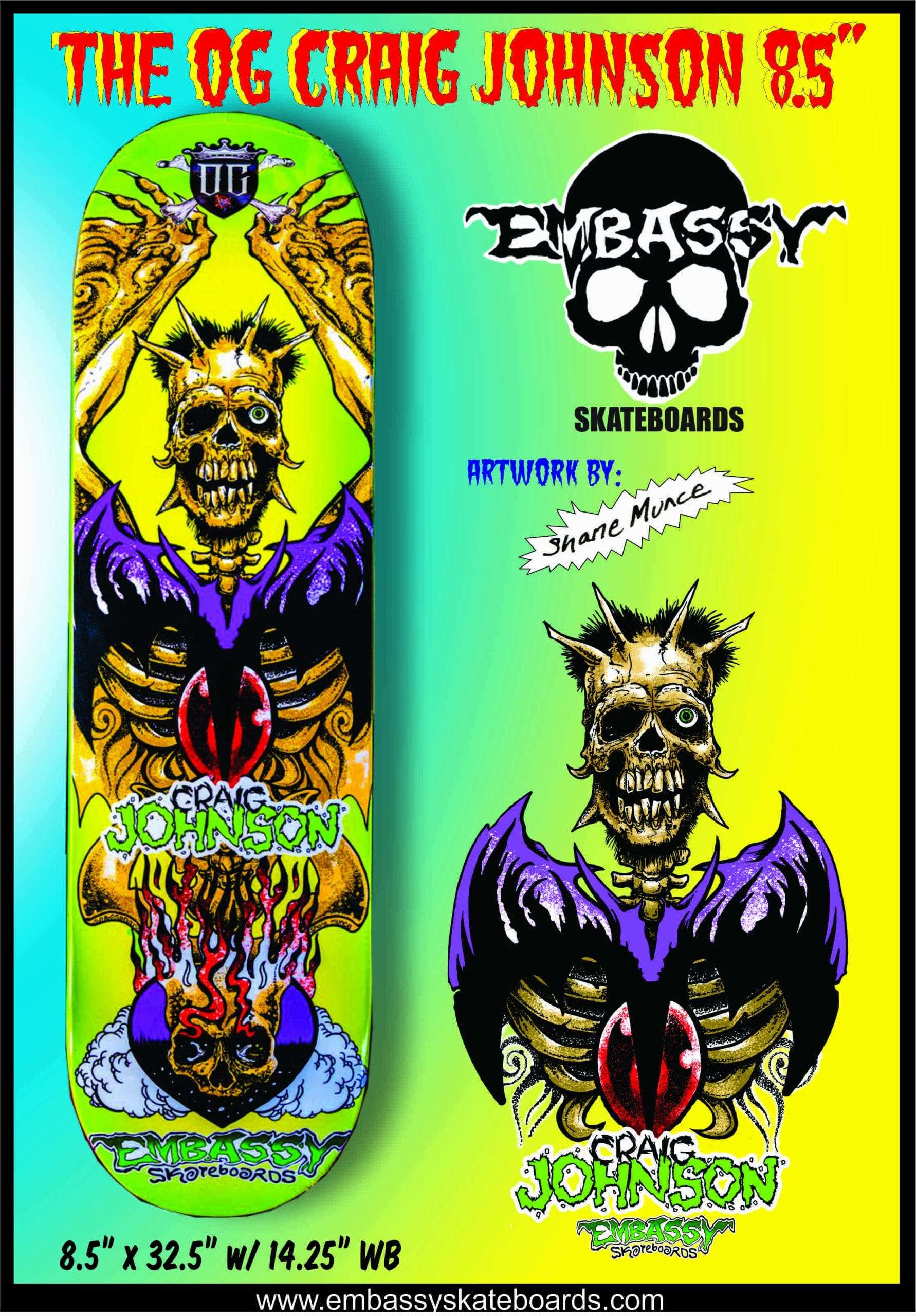 & Free ShippingCraig Johnson in 8.5″ x 32″ w/ 14.5″ Wheel base. Artwork by Shane Munce. Comes with top white skully graphic. It’s the OG Series graphic in FULL Color madness. This deck is 100% Embassy approved, 7 ply Canadian Maple hard wood.
