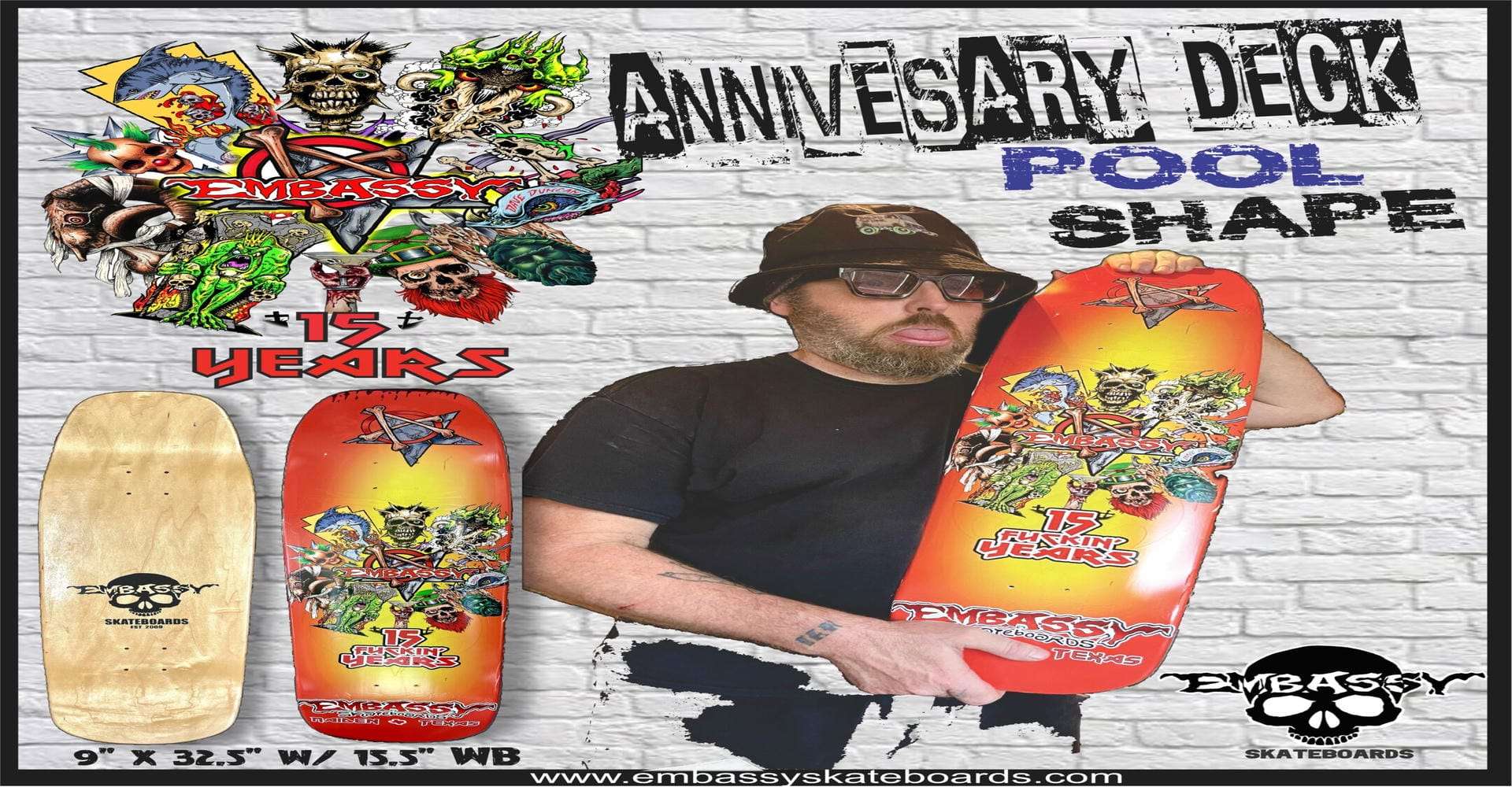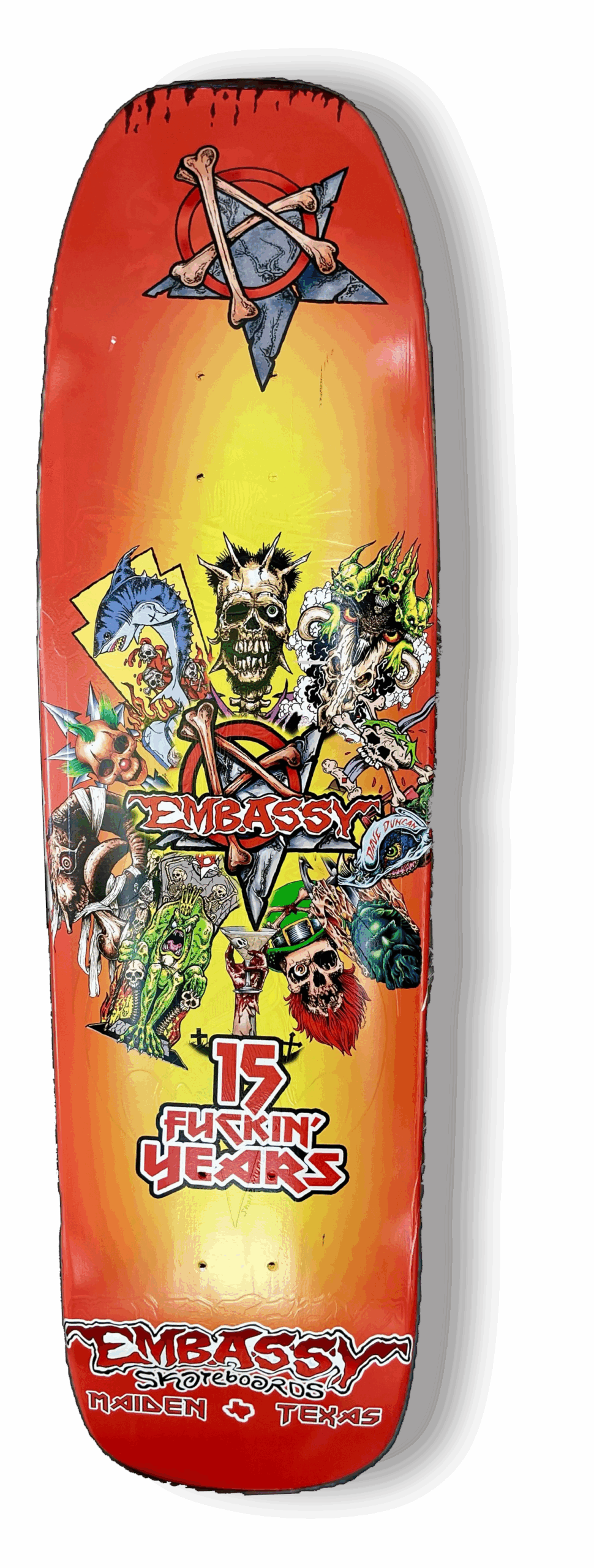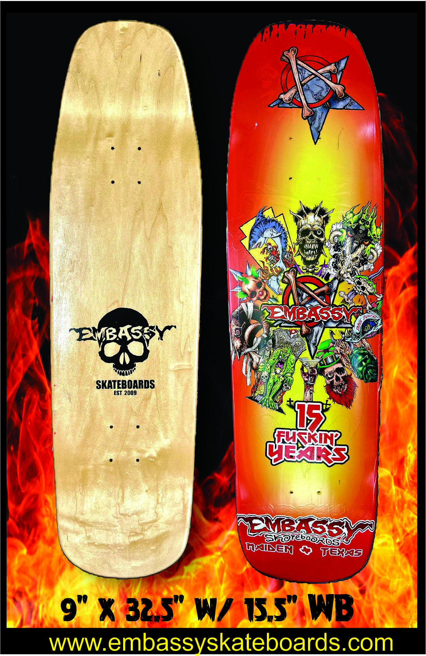 & Free ShippingIntroducing the “SPECIAL LIMITED EDITION” Embassy 15 year anniversary Pool Shape, with top “Embassy Skully”graphic 9.2″ x 32.5″ w/ 15.5” Wheelbase. This gem comes in natural veneer with medium concave. It’s not just a wall hanger. It has a lot to say with a multi of graphics throughout the years. It’s a sunshine orange fade, only 50 will be made in this color combo.