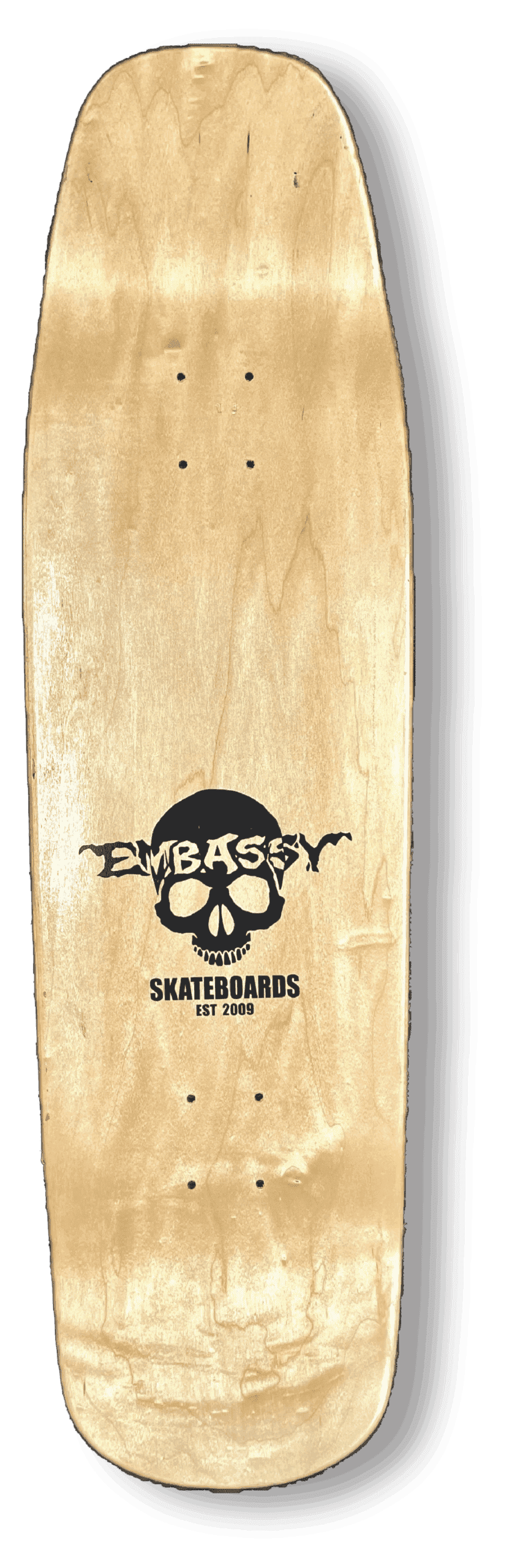 Introducing the “SPECIAL LIMITED EDITION” Embassy 15 year anniversary Pool Shape, with top “Embassy Skully”graphic 9.2″ x 32.5″ w/ 15.5” Wheelbase. This gem comes in natural veneer with medium concave. It’s not just a wall hanger. It has a lot to say with a multi of graphics throughout the years. It’s a sunshine orange fade, only 50 will be made in this color combo.