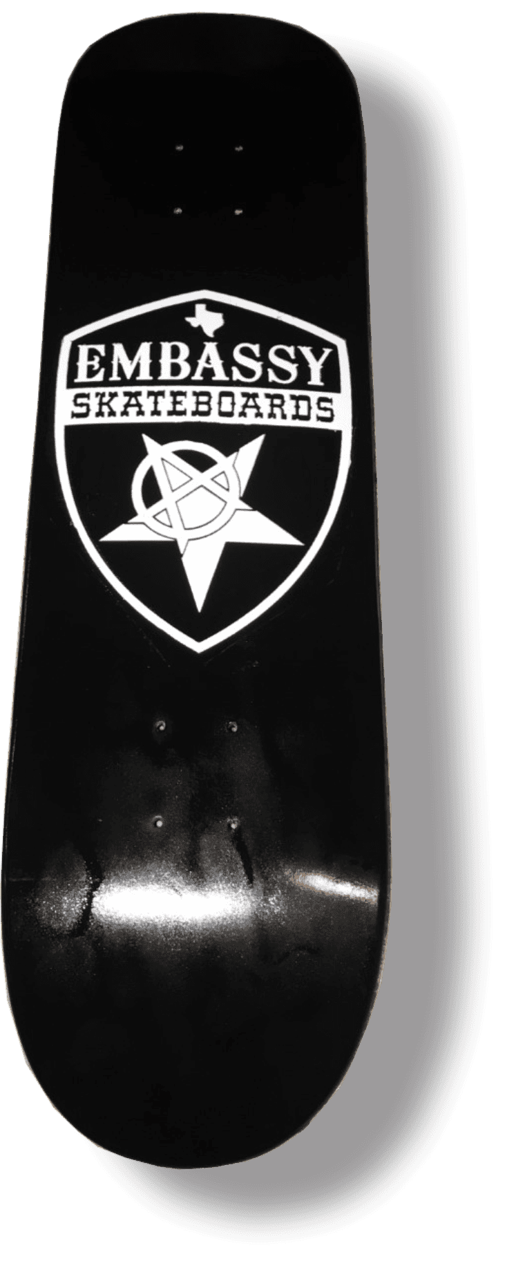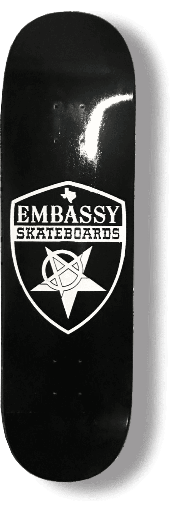 The Classic Embassy Shield Logo Screenprinted in White on Black dipped 8.5″ x 32.5″ w/ 14.5″ wheelbase. This bad boy feels like butter under your feet. 7 ply Canadian Maple wood.