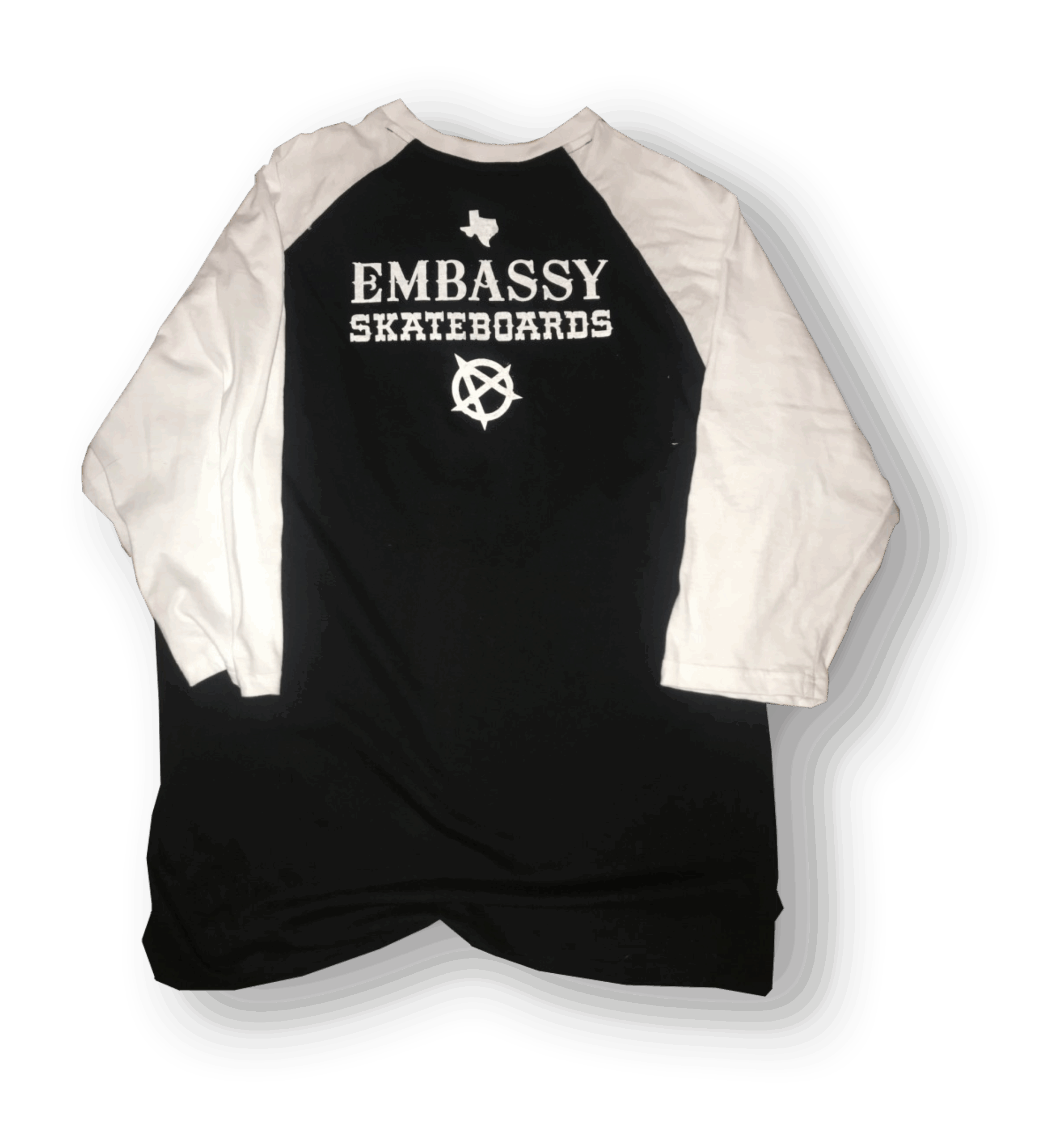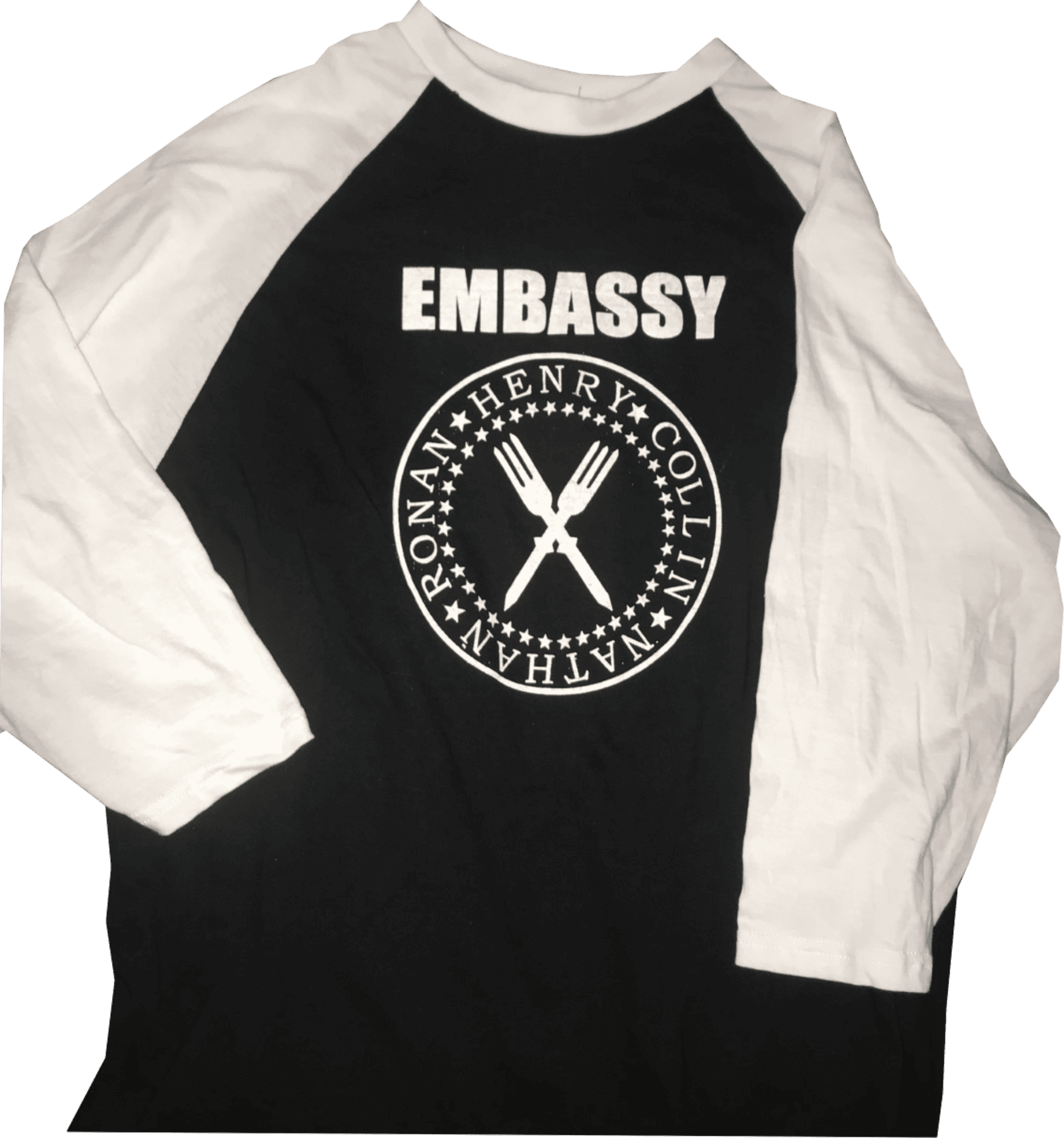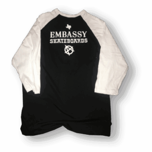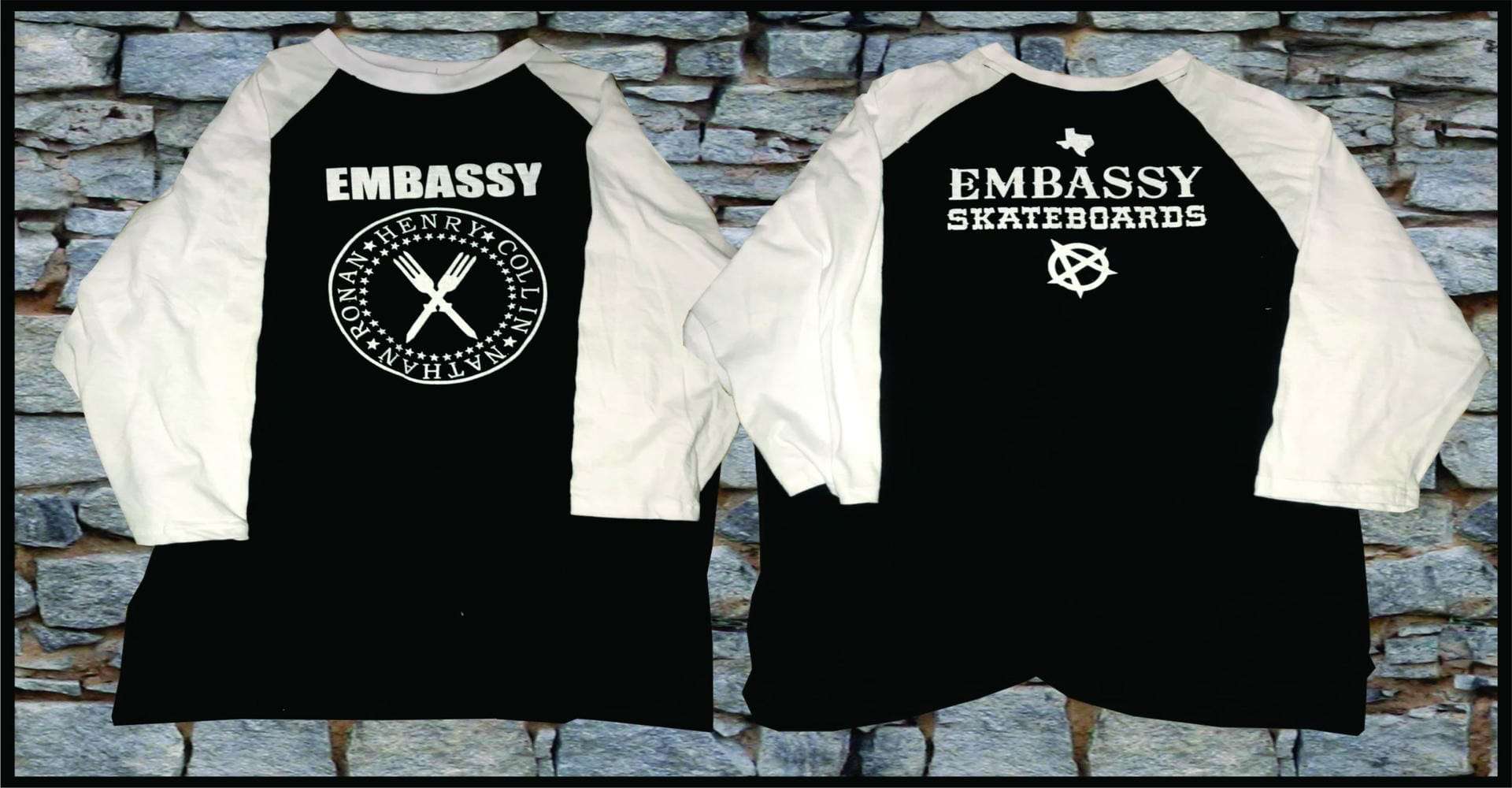 It’s a Ramone’s tribute “Fork Crew” shirt. Come honor the legacy of Virginia Beach skateboarding. Here’s a tribute to the stoke. Printed in white on 100% cotton blend, with back classic Embassy Skateboards logo on Back.