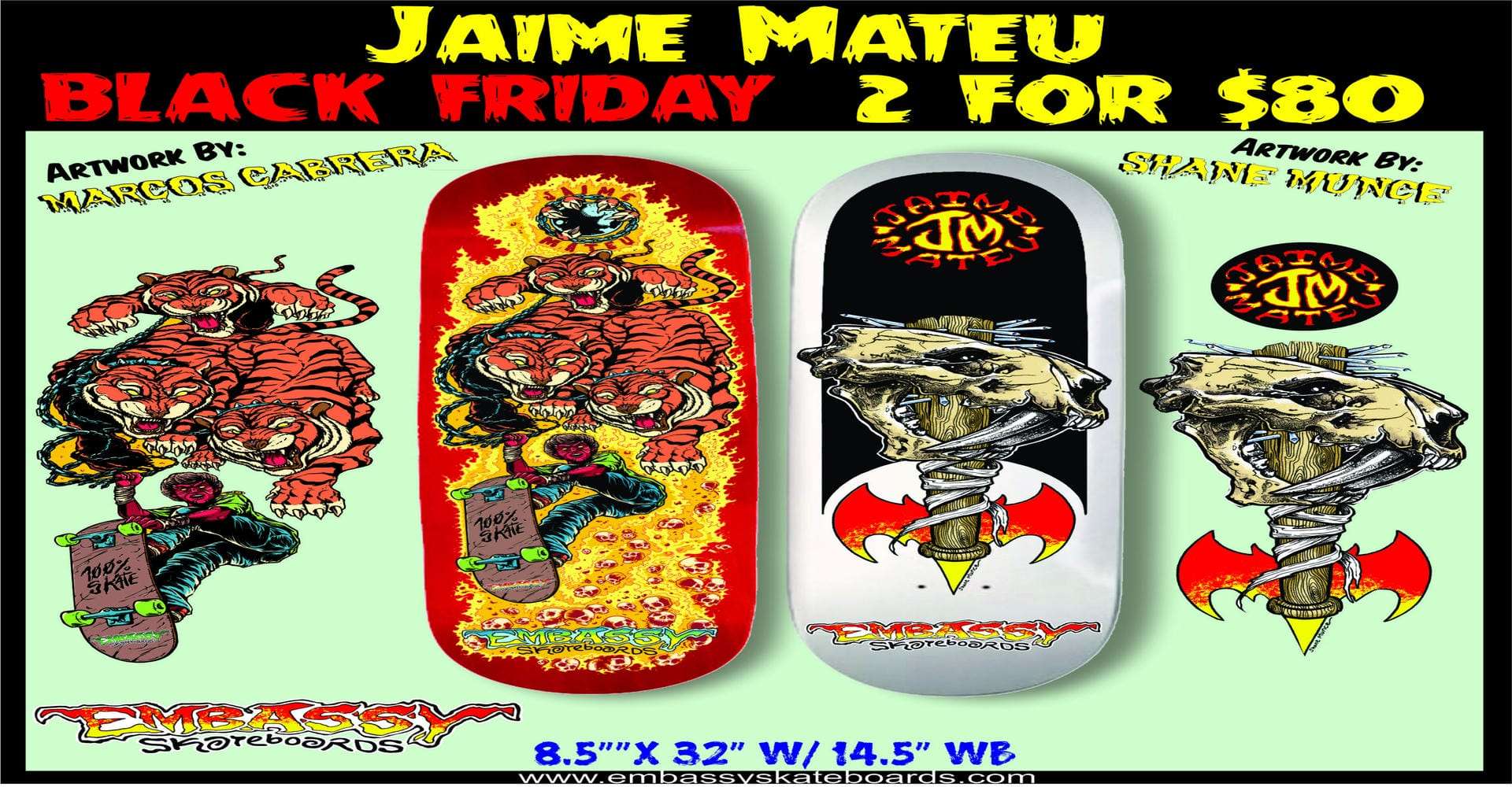 & Free ShippingSay hello to a Texas sized “Everyday” sale. We have both of Jaime’s graphics available in a 2 pack special. Available in his personnel 8.5″ x 32″ w/ 14.5″ WB. shape. Artwork by Embassy “Guest” artist Marcos Cabrera, and Embassy resident artist Shane Munce. Both these decks come with hard concave your feet will sink into. Top Skully graphic. Marcos is a Spanish artist with years of experience working for Spanish brands, and we all know the skills of Shane Munce. It’s a double the fun campaign. This is a first come, first serve. Every order gets the classic white dipped Tigre by Shane, and the 3 tigers graphics are assorted color veneers. This is going to go fast. Treat yourself to a “2 pack” like no other. EVERYDAY SALE STARTS NOW!