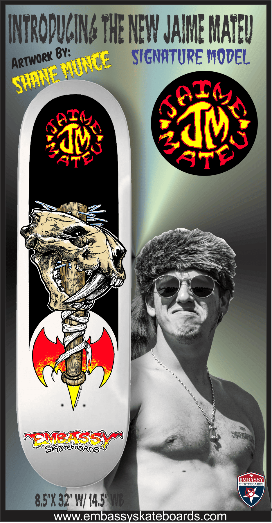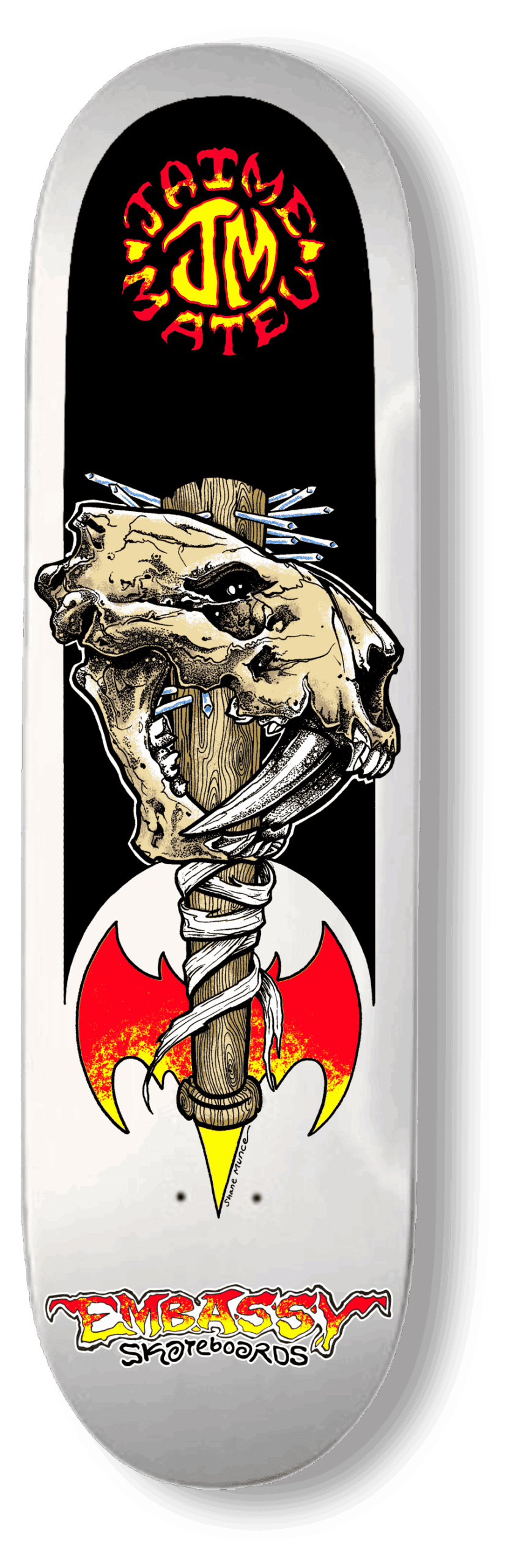 & Free ShippingIntroducing the New Jaime Mateu “Pro” Signature Model, comes in White Dipped, 8.5″ x 32″ w/ 14.5″ WB. shape. Fresh off his Olympic experience, this is HOT off the press. Artwork by Embassy “Ink Master” Shane Munce. This deck comes with hard concave your feet will sink into. Top Skully graphic. and and and and and and anf