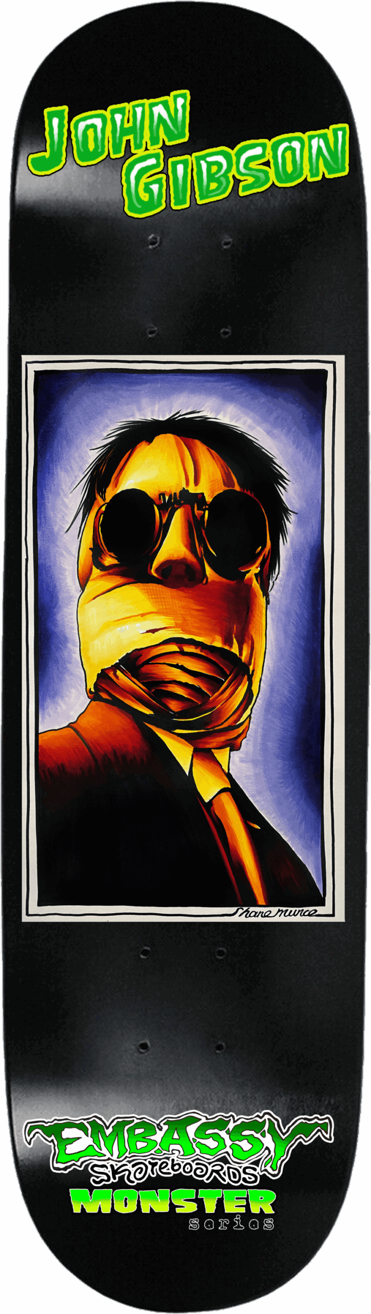 & Free ShippingIntroducing the much anticipated MONSTER SERIES by Shane Munce. John Gibson “Invisable Man” can be seen, and has arrived. No cow skull here, this is an instant classic like you’ve never seen him before. Artwork by “Inkmaster” Shane Munce. Measuring in at 9″ Wide, 32.5″ Long, 15″ wheelbase, Modern functional concave. 7 ply Canadian Maple Wood. Comes with top screen-printed Skully graphic in white. This is a very, very one time limited run on this colorway. ONLY 10 will be available in the 9″. FREE Goodies in every box!