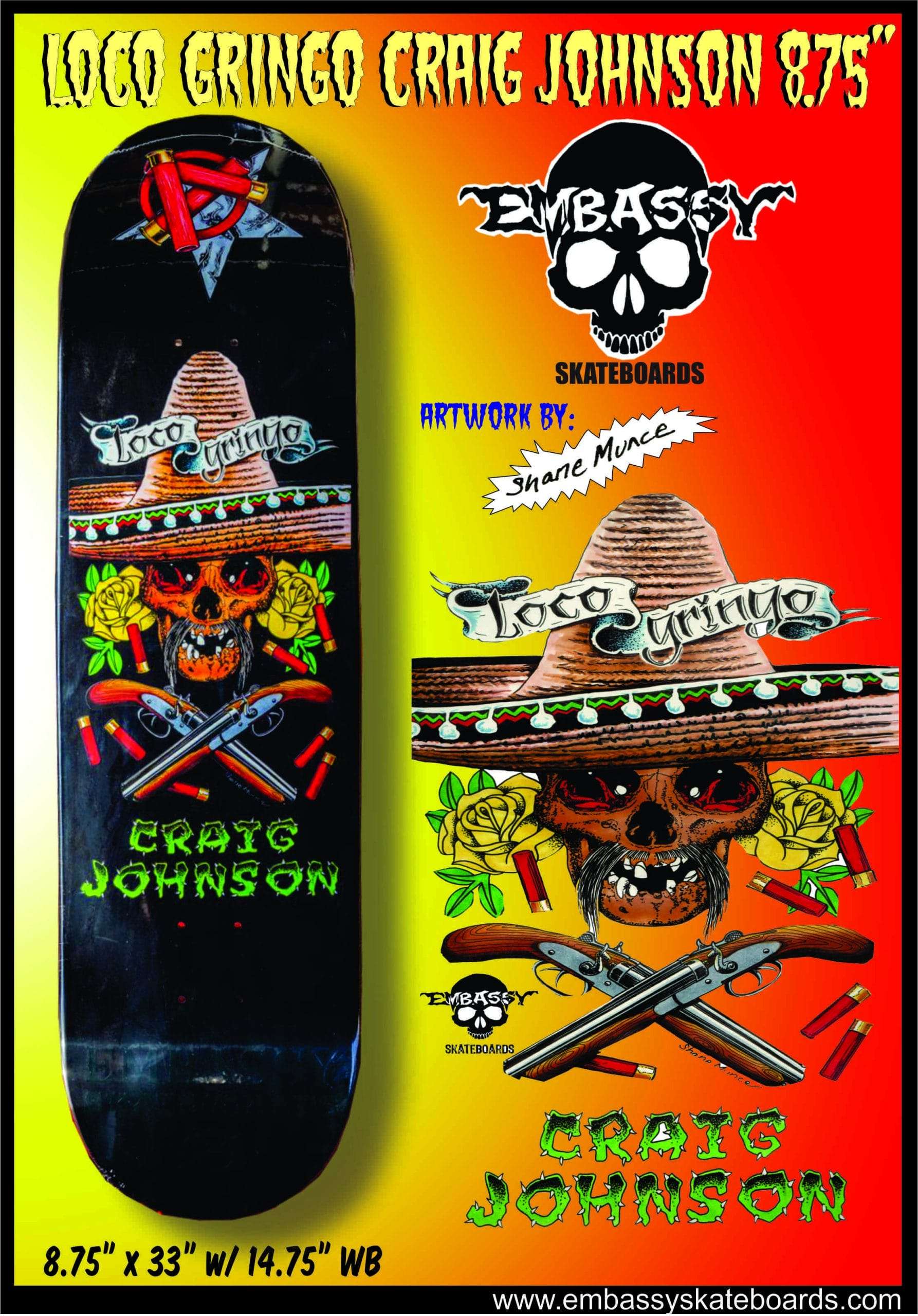 Loco Gringo, Craig Johnson in 8.75″ with a 14.75″ wheelbase on black dipped. Artwork by Shane Munce. Comes with top white skully graphic.