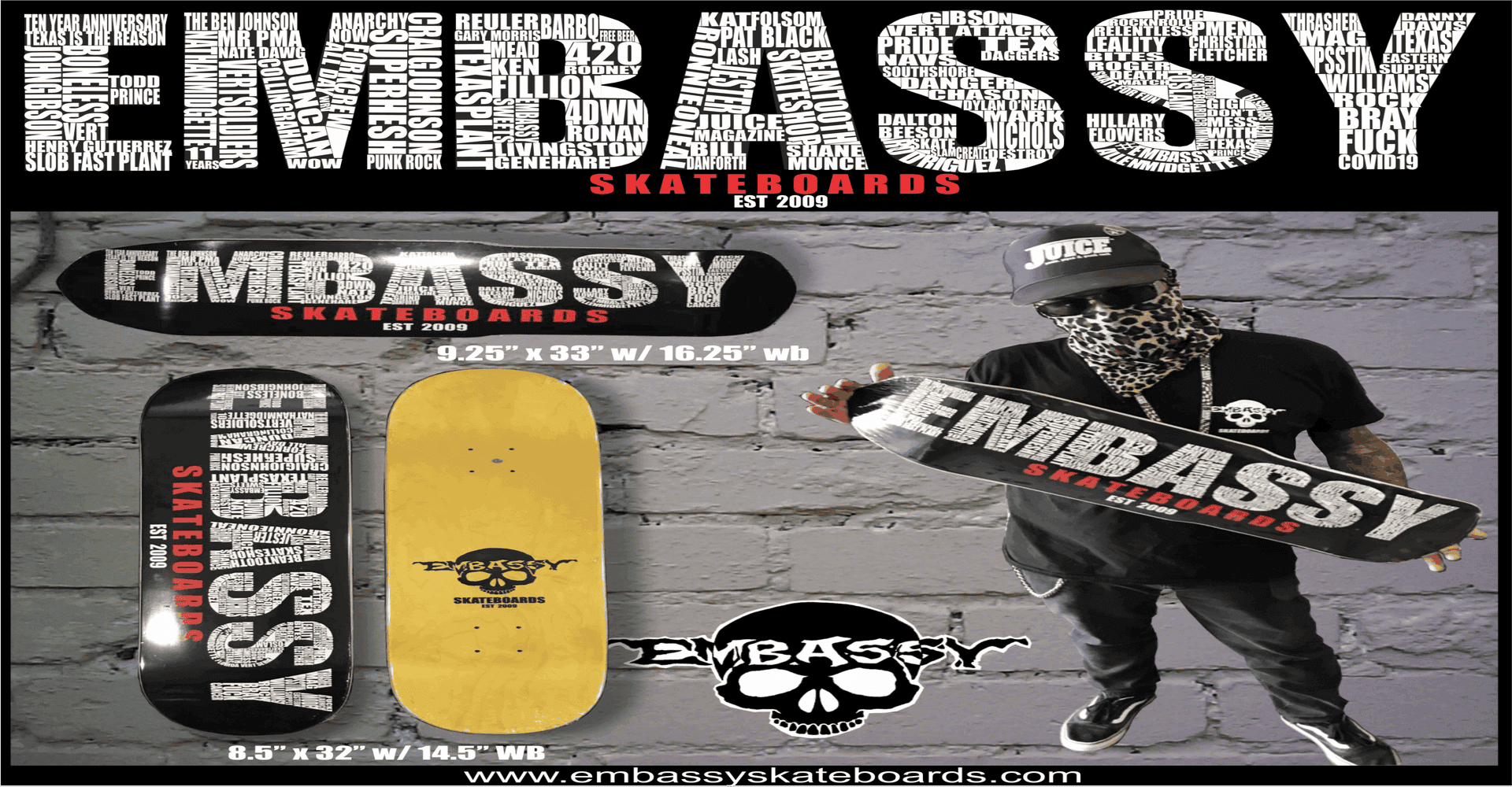 Introducing the “Embassy Ten Year Anniversary” deck. Artwork by Lee Leal. This bad boy comes on the popsicle shape 8.5″ x 32.” w/ 14.5″ wheelbase. Perfect for all terrain. It’s a special time, and this graphic has a lot to say.