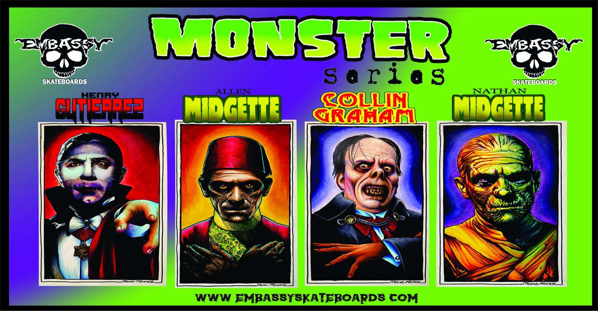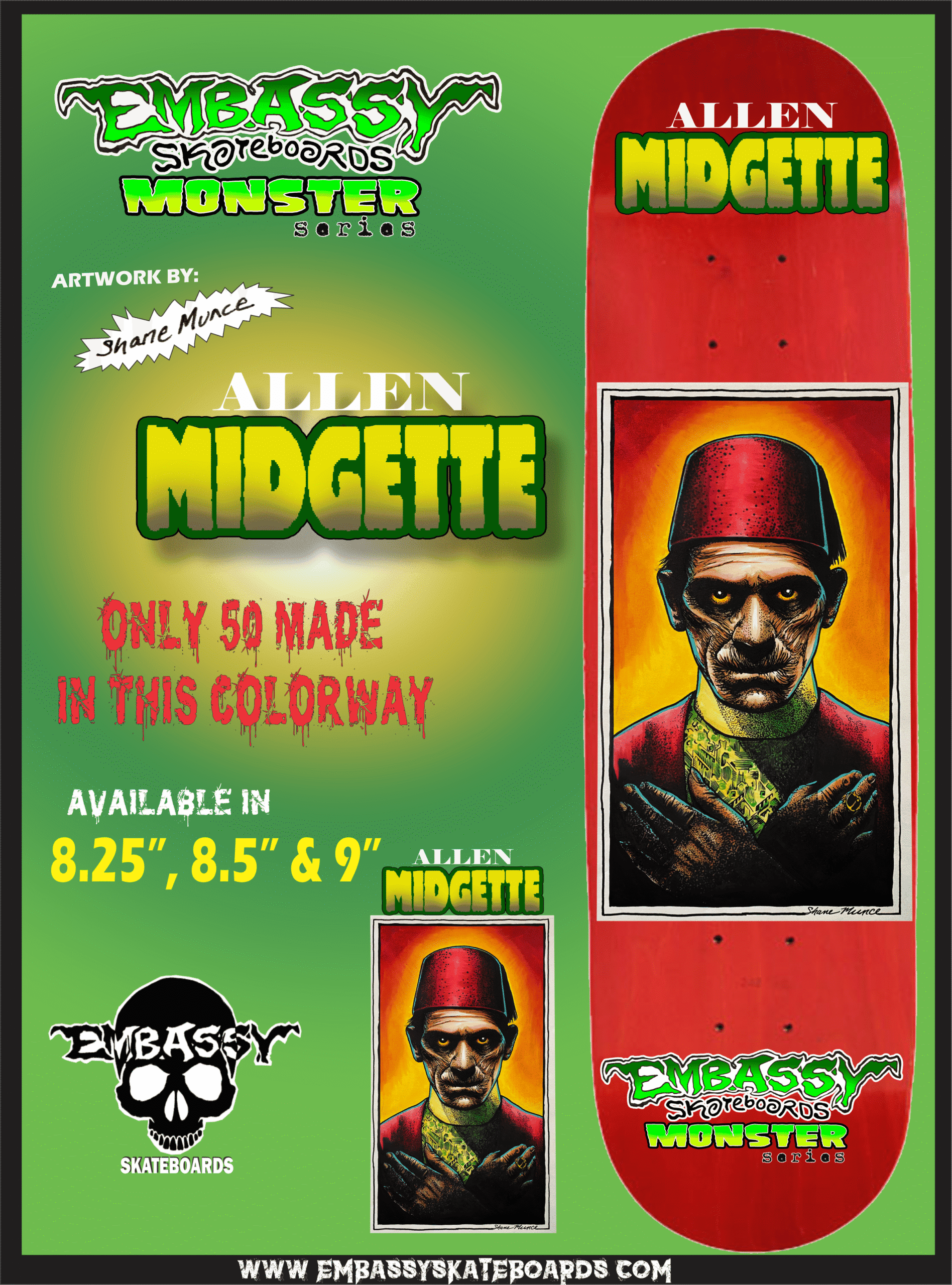 We’re making it easy for you to get the whole collection. It’s the Texas Quad play. Get the HENRY GUTIERREZ, ALLEN MIDGETTE, COLLIN GRAHAM & NATHAN MIDGETTE Monster series in one swipe. Collect all 4 of them. These bad boys are regularly $65.00 a piece. If you get’em all together, it’s $240.00. They all come in 8.5″ x 32″ w/ 14.5″ wheelbase, 7 ply Canadian Maple. Comes with Embassy Skully screen printed on top. Artwork by “Embassy Inkmaster” Shane Munce. Also FREE Full color Monster Tee-shirt. Please specify the size of the shirt on your order.