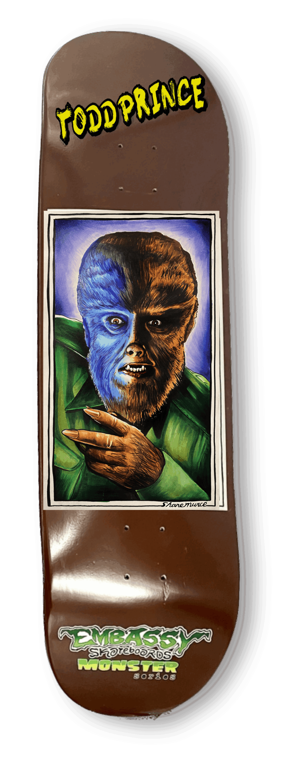 & Free ShippingSay hello to the Todd Prince “Werewolf”. Here’s Todd like you’ve never seen before. He wears it on his chest. Shane Munce brings “The Epic of Gilamesh” to life. Measuring in at 8.5″ Wide, 32.5″ Long, 14.5″ wheelbase, Modern functional concave. 7 ply Canadian Maple Wood. Comes with top screen-printed Skully graphic in white. This is a very, very one time limited run on this colorway of “Dark Chocolate”. Special sticker pack and goodies in every order. Everyone needs a little Todd Prince in their life.