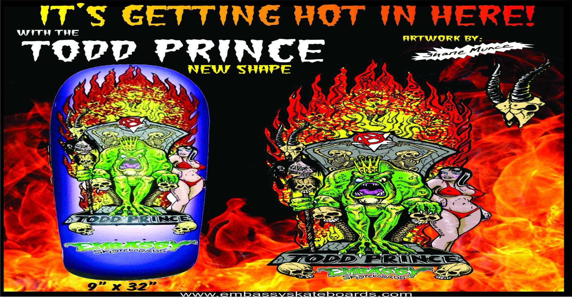 & Free ShippingIntroducing the Todd Prince 9″ x 32.” w/ 15″ wb. Artwork by Shane Munce. This bad boy comes in a killer party shape geared for action, with top Embassy Skully sreen printed graphic. This is a SPECIAL one time run in this colorway and shape.
