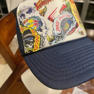 Caps $25.00 Add to cartIt’s the season, so here’s the Embassy Dave Duncan 5 panel foam snapback trucker cap. It’s a “Multi Print” like never before. Featuring 3 of “Double D’s” graphics on one cap, it’s FUN, FUN, FUN !! Artwork by Martin Varbaro.